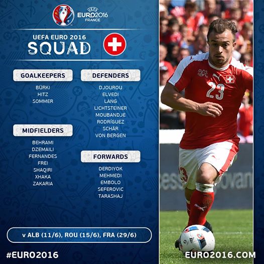وفيما يلي تشكيلة سويسرا لخوض "يورو 2016":
