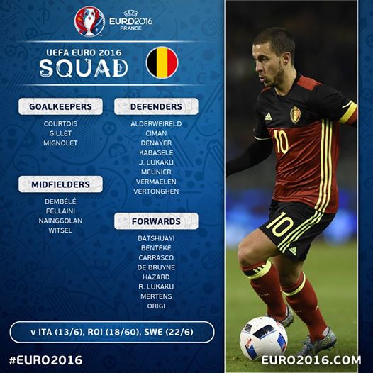 وفيما يلي تشكيلة بلجيكا التي اختارها المدرب مارك فيلموتس، لخوض نهائيات كأس أوروبا المقررة بين 10 يونيو و10 يوليو :