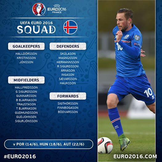 واختار السويدي لارس لاغرباك، مدرب منتخب إيسلندا، التشكيلة التالية لخوض نهائيات كأس أوروبا 2016: