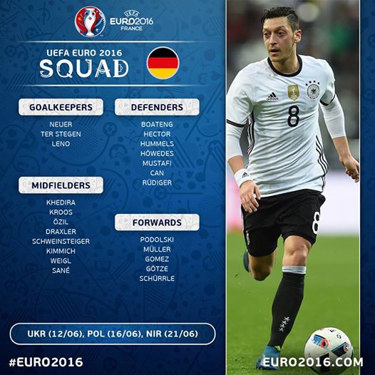 وفيما يلي التشكيلة النهائية للمنتخب الألماني لخوض نهائيات "يورو 2016" التي تستضيفها فرنسا في الفترة من 10 يونيو وحتى 10 يوليو :
