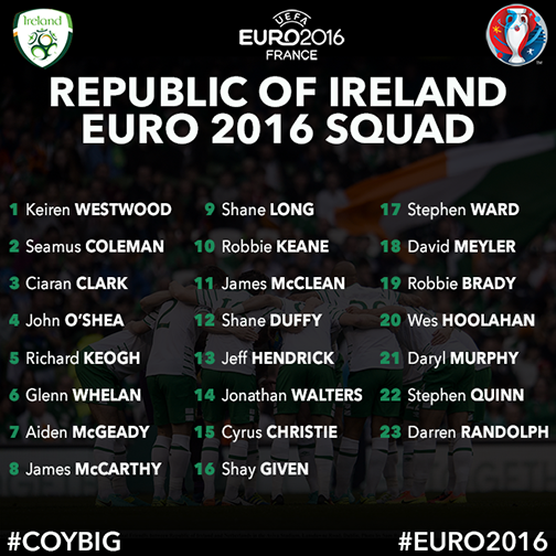 وفيما يلي تشكيلة المنتخب الإيرلندي المكونة من 23 لاعبا: